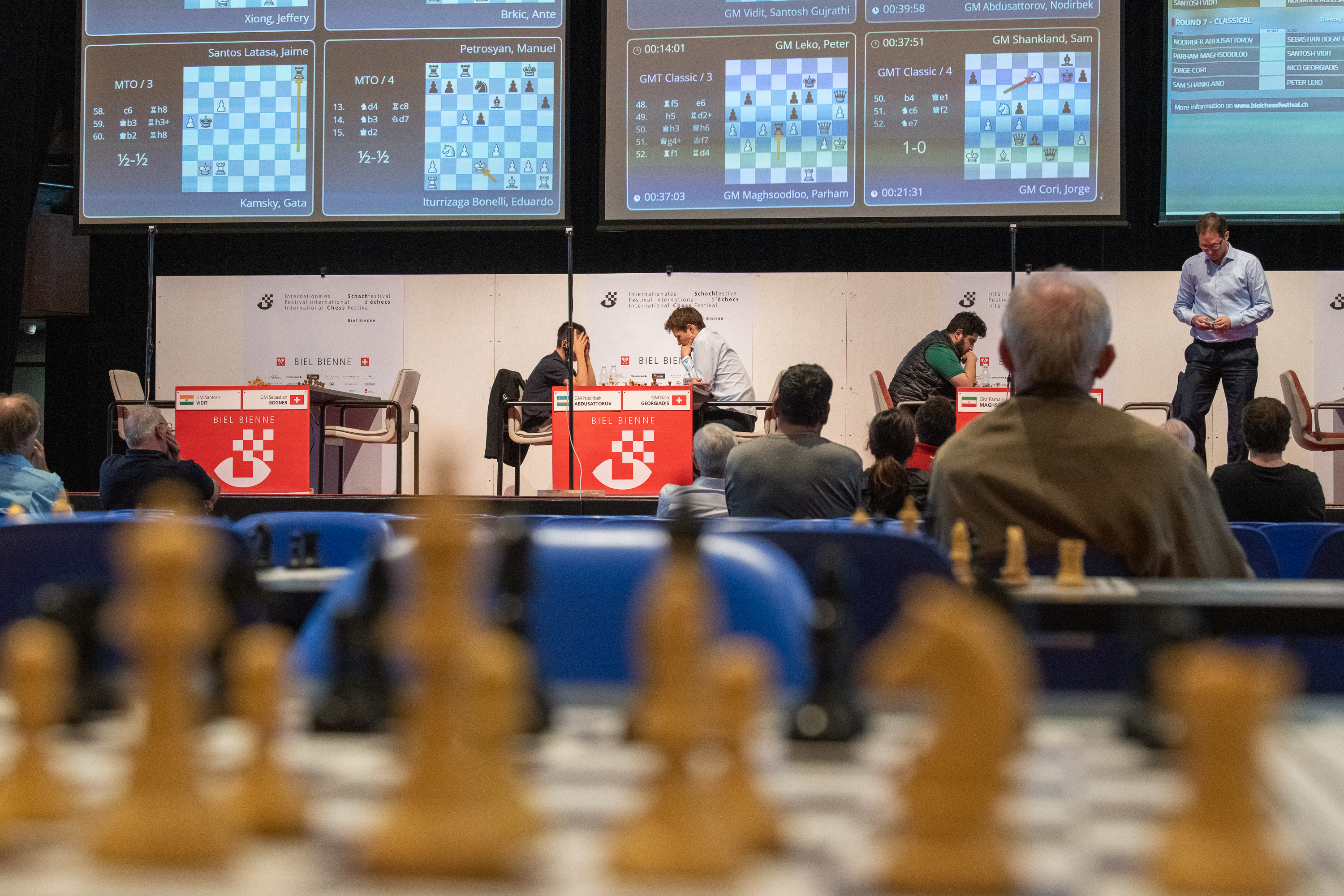 In the table there is a situation with three different groups: the two leading GM Vidit (30 points) and GM Shankland (26 points) will probably decide the tournament victory among themselves. The advantage after the 5th round is clearly on Vidits side. In the wide midfield (23.5 to 21 points) various shifts are still possible. The two Swiss GM Georgiadis (11 points) and GM Bogner (10 points) are at the end of the two tables.