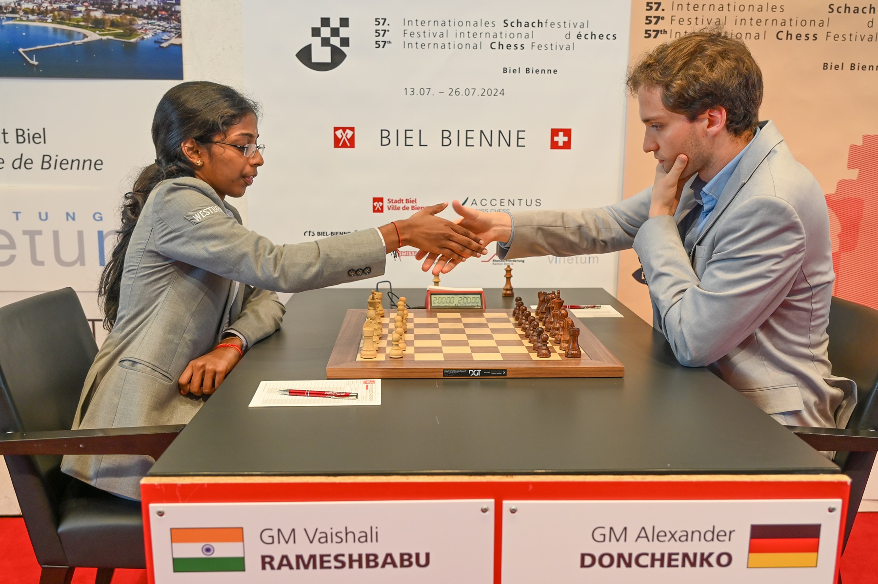 In today's top match, leader Alexander Donchenko had to play yesterday's surprise winner – Vaishali Rameshbabu, who won as the lowest rated player against the top seed Bjerre. And Vaishali once again lived up to her role as the favourite scare: in just 27 moves she also defeated the No.2 seeded German Donchenko! Vaishali has thus moved up to second place in the interim rankings. The new leader is Salem Saleh, who also scored a second win in a row, today against the still hapless Jonas Bjerre, who doesn't seem to have arrived in Biel yet. Despite a promising position, Marc'Andria Maurizzi was unable to join the winners, as he was unable to capitalise on his position against Ihor Samunenkov and ultimately had to settle for a draw – the first one of the GMT-Challengers.
